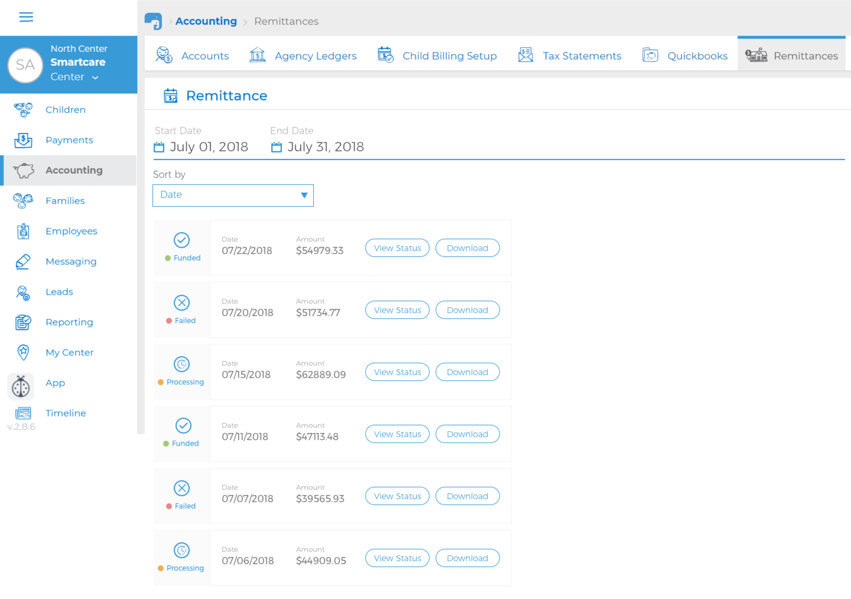 Smartcare processes financial transactions (ACH and credit card) for its child care centers. Once the funds are available, Smartcare remits the money to the center’s bank account. Smartcare will then also create a remittance (once the funds are distributed to the center) which is a downloadable PDF that will outline the payment amount for the center including any fees deducted (Smartcare collects a small transaction fee for ACH and credit card payments processed through our system).